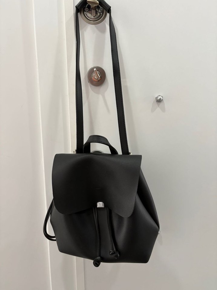Günlük kullanım için minimalist tarzda, tokalı kapaklı siyah deri sırt çantası. Desensiz ve şık tasarıma sahiptir.