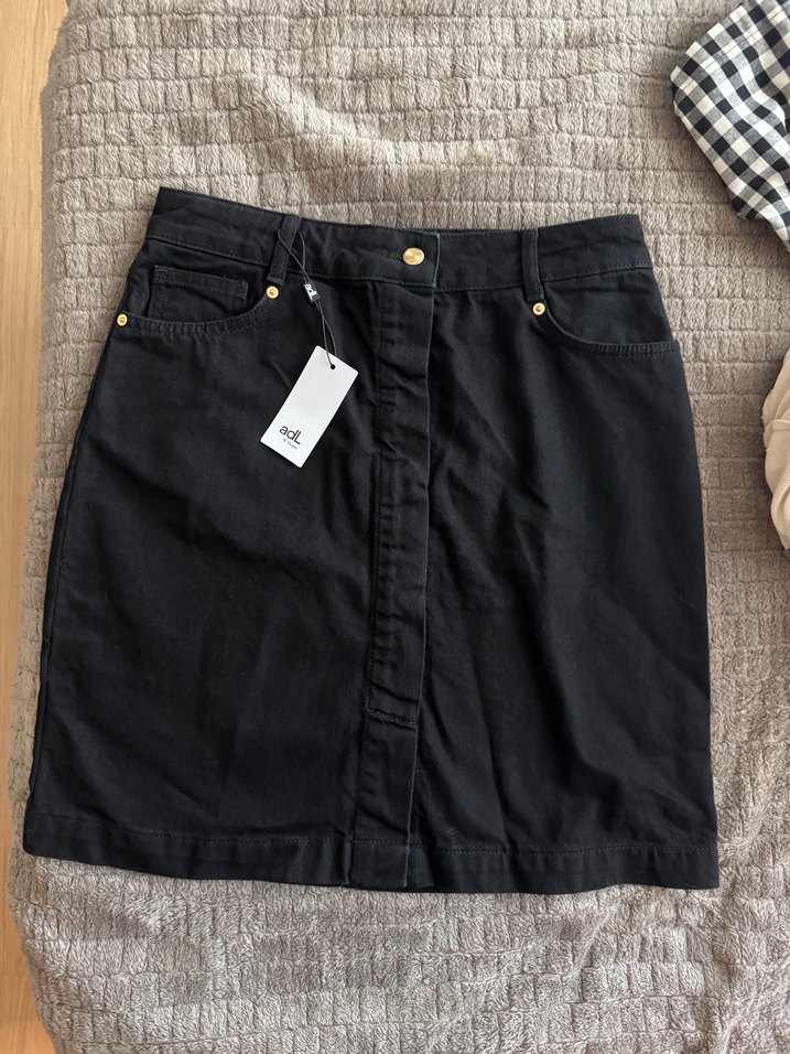 Siyah kot kumaştan, önü düğmeli düğmeleri için ekstra kumaş geçilmiş etek hiç kullanılmadı.