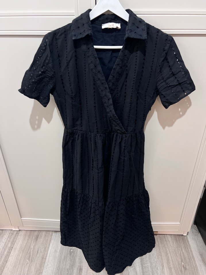 Kısa kollu, V yaka, dantel işlemeli ve fırfırlı siyah midi elbise. Yumuşak sentetik kumaştan, günlük kullanım için uygun. Adil Işık marka s beden elbise