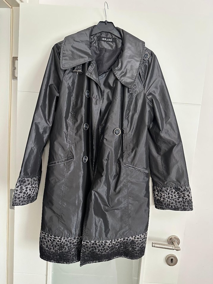 Siyah sentetik kumaştan, düğmeli ve notched yakalı. Kollar ve etek ucu desenlidir, günlük kullanıma uygundur. Düğme bir tanesi eksik ve cep kenarı küçük deforme vardır resimleri eklenmiştir.