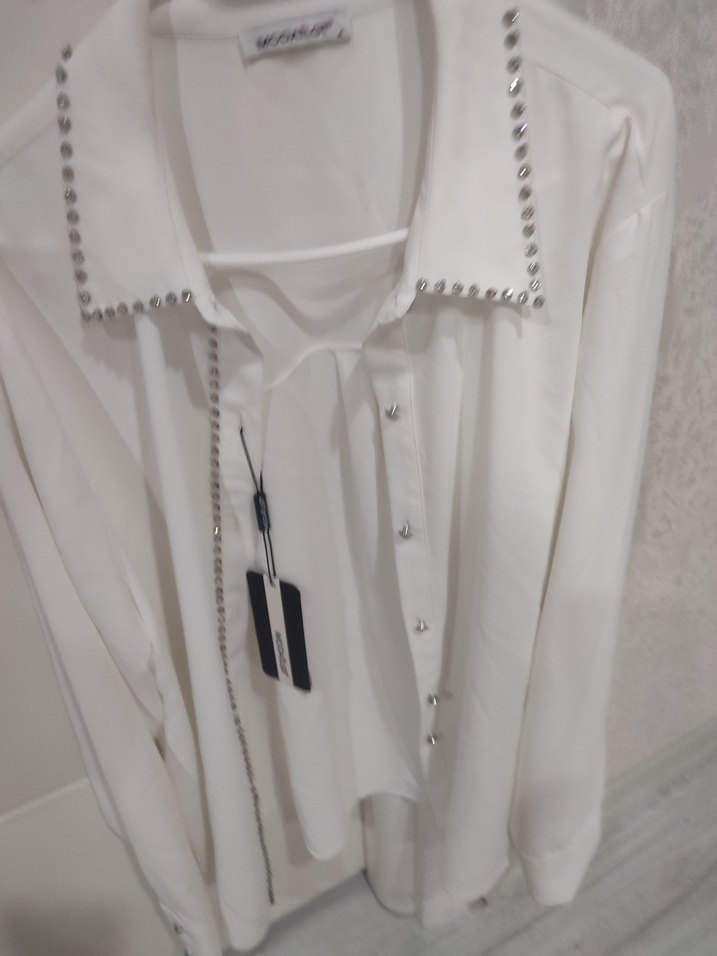 Düğmeli önü ve yakasında metal detaylı, bol kesim beyaz uzun kollu gömlek. Pürüzsüz sentetik kumaştan, günlük kullanım için uygundur. 44 yeni