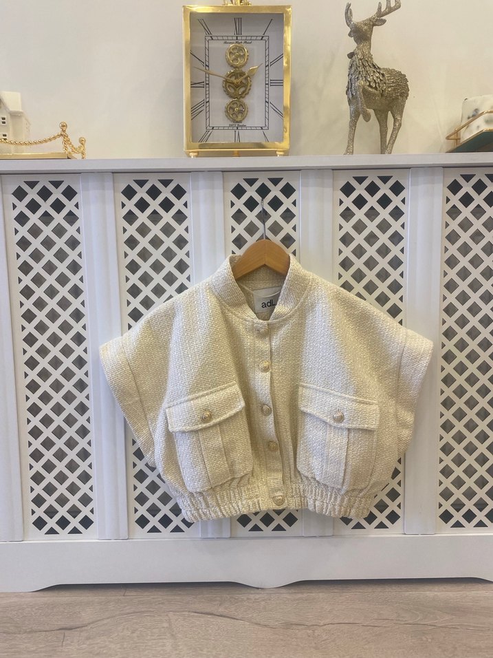 Etiketli hatasızdır.düşük kol,kendinden simli,önden düğmeli,içi astarlı,eteği lastikli çok şık bir ceketgold düğme detayı ve kendi ipinden sim parşaklığı ile renk çok güEl uyum sağlamıs#adil ışık#bomber ceket#simli#gold düğme#