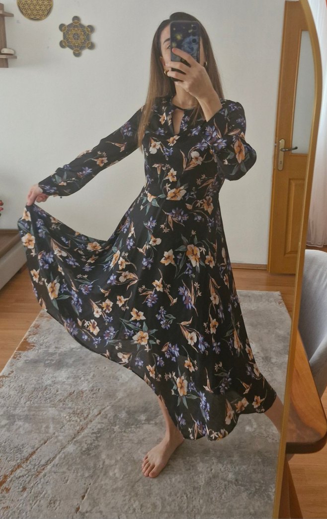Uzun siyah elbise, çiçek desenli ve bol kesimdir. Uzun kollu, V yaka ve dökümlü tasarıma sahiptir, yumuşak, hafif parlak, ipeksi kumaştandır. Uçuşan eteği ve kolları çok havalı. Kumaşı ipek gibi çok zarif. Eteği hafif asimetrik 1 kere giydim.