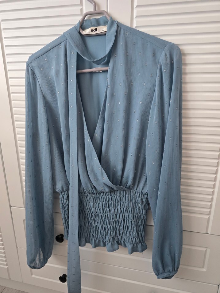 Adil ışık V Yaka Drapeli Mavi Uzun Kollu Bluz