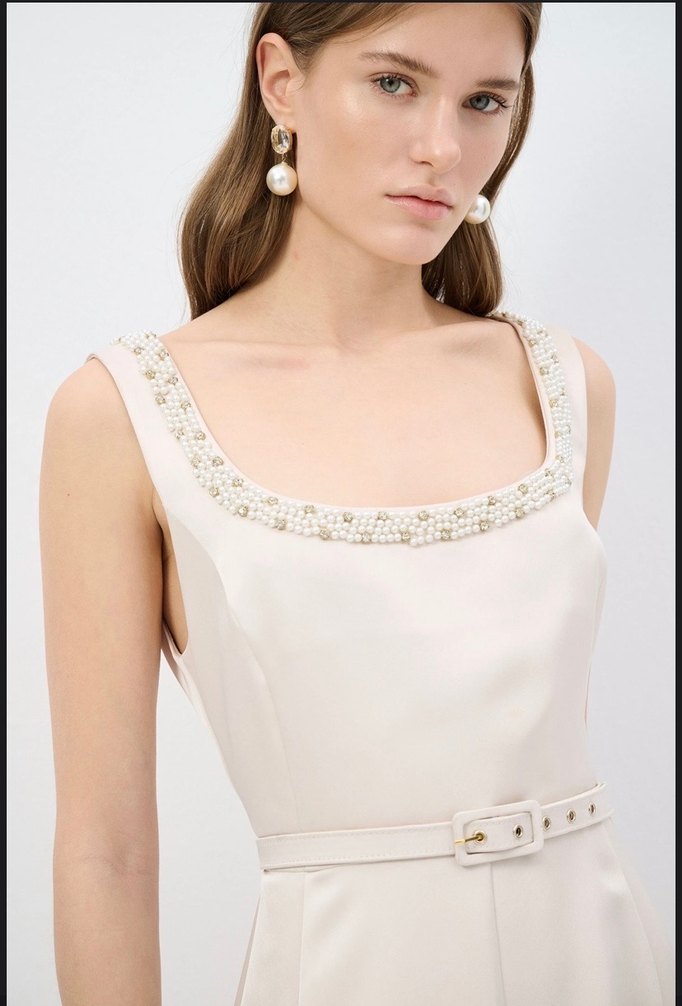 İncilerle süslenmiş kayık yaka, kolsuz tasarım ve kemerli bel ile modern klasik tarzda kısa beyaz düğün elbisesi Etikwtli hatasızdır.kuğu gibi bir elbise nasıl kibar nasıl zarif,rengi yaka inci detayı dökümlü oluşu efsanekeneri yoktur fiyatına yansıtılmıstır.#adil ışık#nightzom#incili elbise#kız isteme#nikah elbisesi#söz#zarif elbise#.