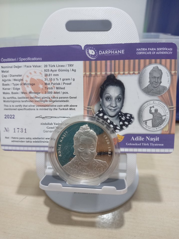 Parlak altın tonlu, 925 ayar gümüşten 2022 yılında Darphane tarafından çıkarılmış Adile Nasit hatıra parası, 20 Türk Lirası değerinde ve 31,10 gram ağırlığında.