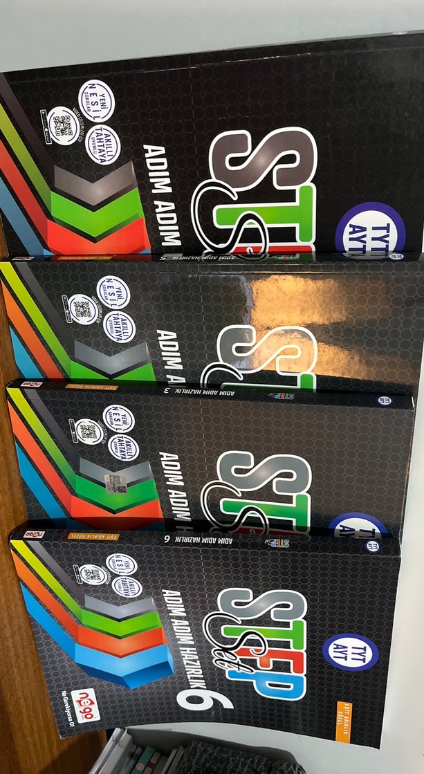 Adım Adım STEP serisi, TYT ve AYT sınavlarına yönelik kapsamlı lise ders kitapları sunar, adım adım öğrenimi destekler. Altıncı kitap sıfır Beşinci kitapta dört test çözüldü  Dördüncü kitapta bir test çözüldü Üçüncü kitapta bir sayfa çözüldü