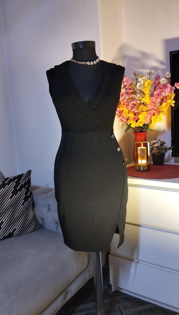 adl 34/xs beden boy 80 cm, Düğmeli Siyah V Yaka Midi Ofis Elbise