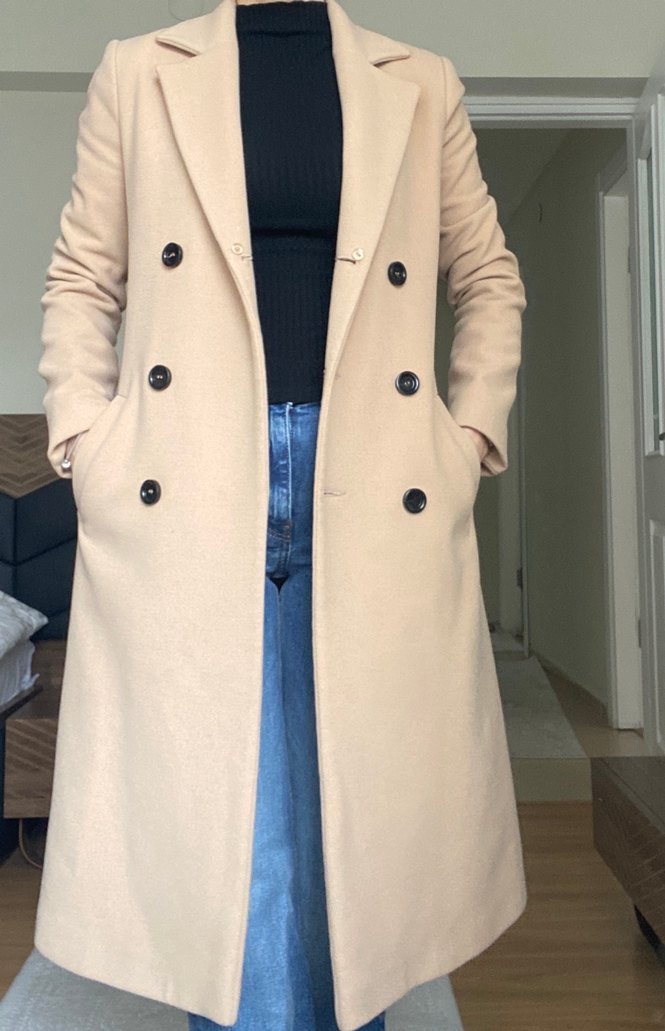 Bej renkli, düğmeli, normal kesim midi kadın kaban. Uzun kollu, yumuşak ve sıcak kumaştan günlük kullanıma uygun, desen içermeyen şık bir model.