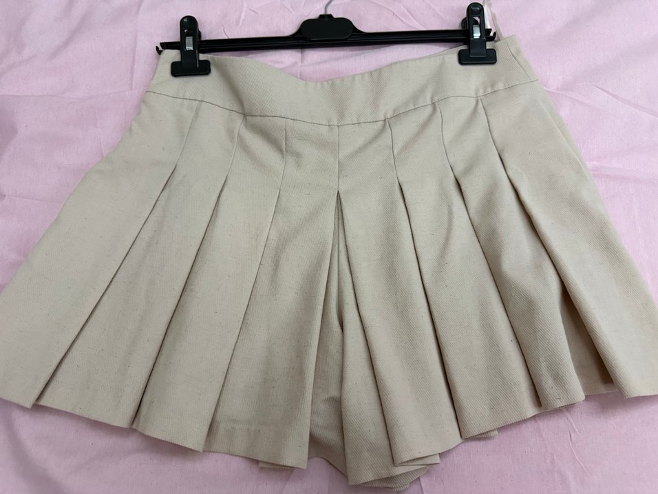 Yumuşak keten kumaştan bej pliseli mini etek, bol kesim, günlük sokak stiline uygun.