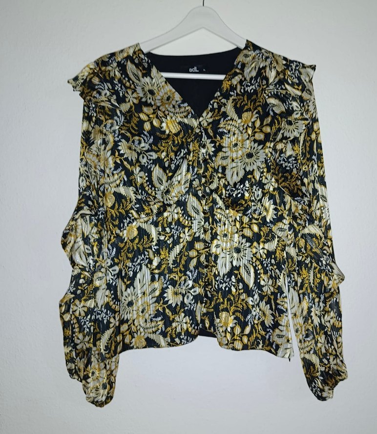 Kolsuz, V yakalı ve bol kesim desenli sarı bohem bluz., günlük kullanım için uygun, drapeli tasarıma sahip.