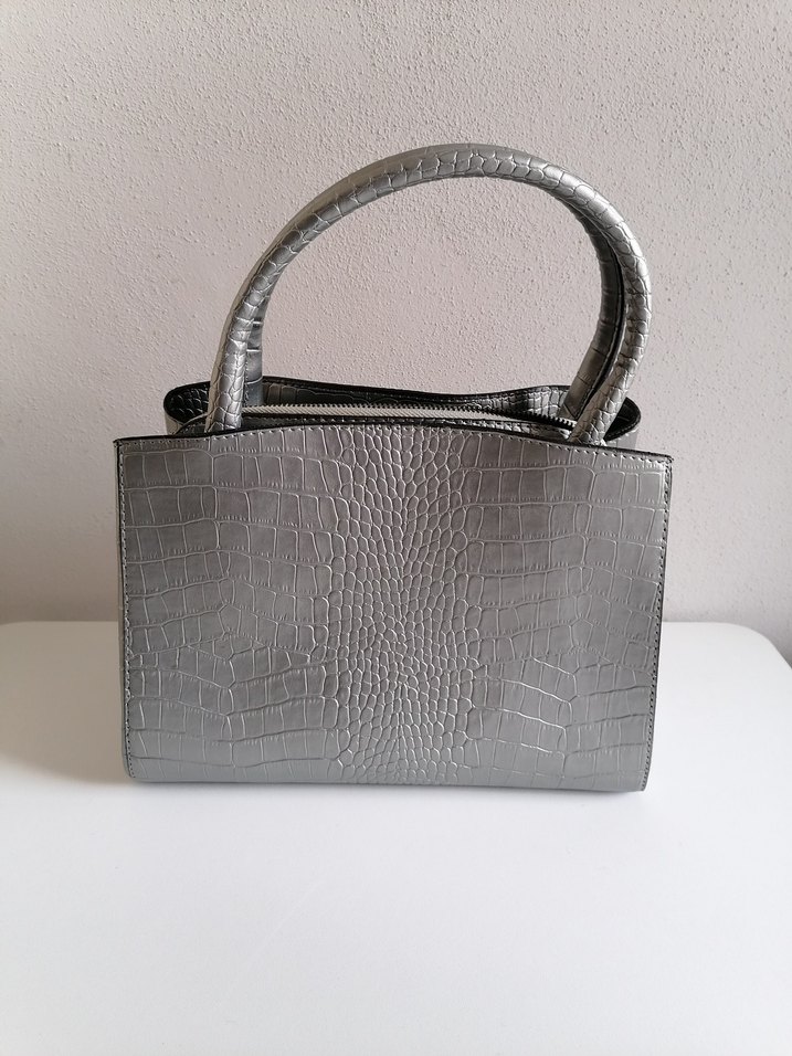 Yeni gibi İçindeki etiketi mevcut Gri deri yılan deseni ve tokalı tasarıma sahip kadın çantası, Askısı da yanında