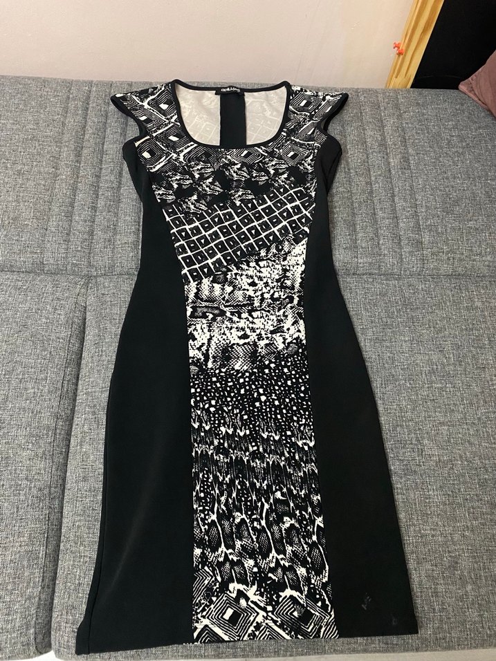 Sorunsuz tertemiz. Siyah ve gri desenli ön paneli, dantel detayları ve kayık yakası olan, sentetik kumaştan yapılmış, kolsuz ve vücuda oturan kalem elbise.