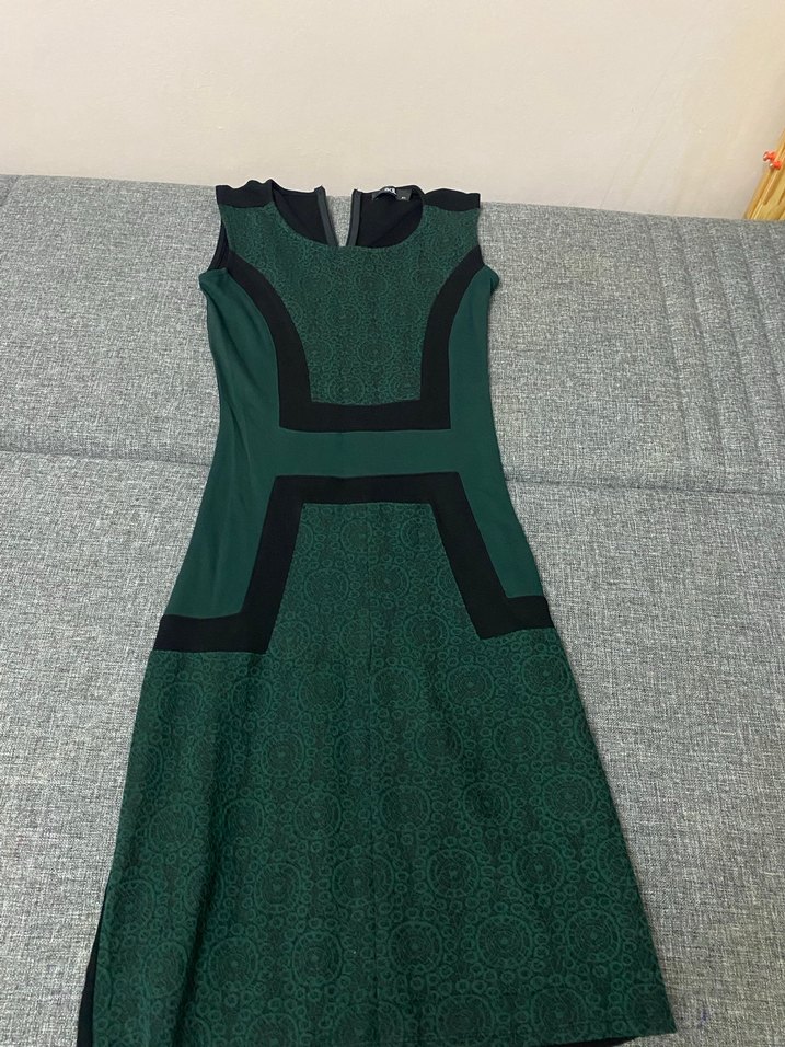 Sorunsuz tertemiz. Desenli kumaştan, uzun ve kolsuz yeşil elbise. Fitted kesimiyle çağdaş ve avangart tarz sunar.