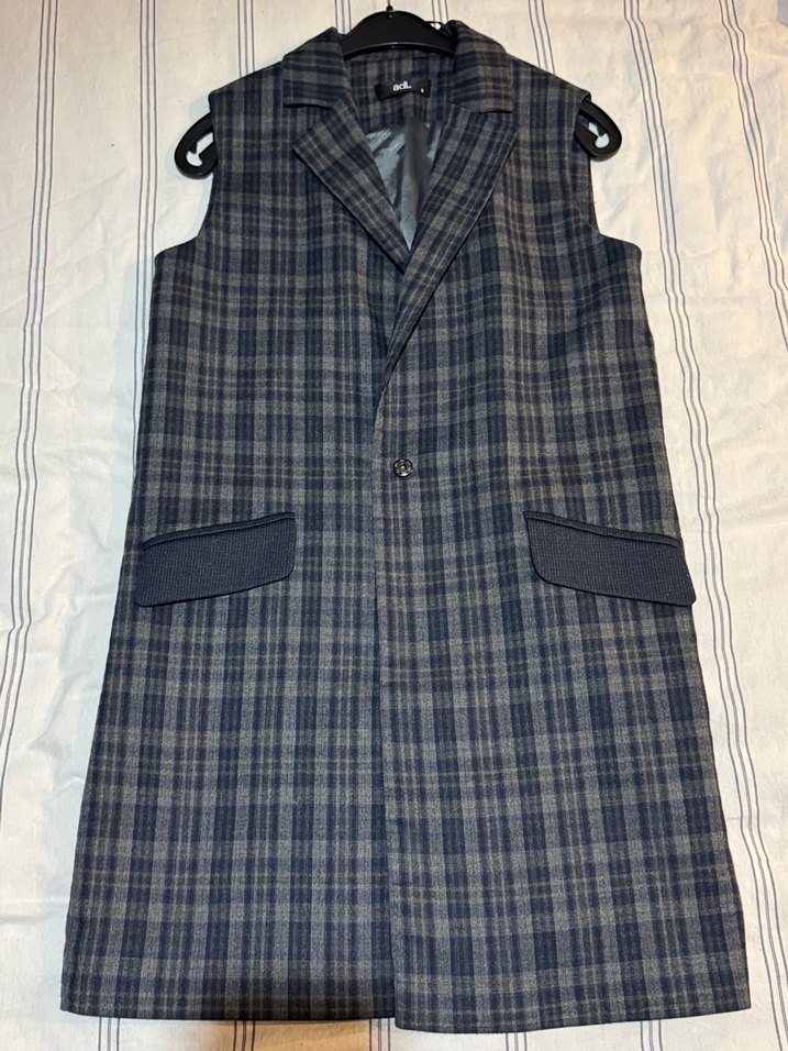 Düğmeli, yakalı ve kolsuz bu yelek, pamuklu kumaştan yapılmıştır. Gri tonlarda ekose desenli, midi boyda ve regular fit kesimdedir. Ofis için uygun, trend sokak stiline uygundur. Adl markadır s bedendir hiç kullanılmamıştır.