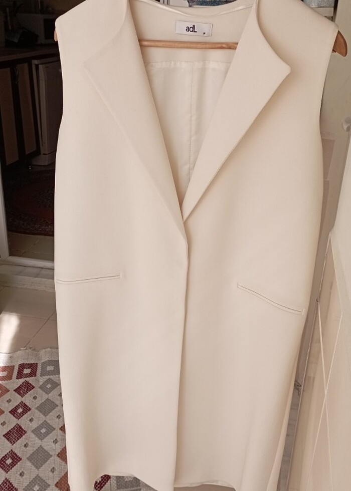 Adil Işık marka, ekru renkli, çıt çıt kapamalı, süs cepli, arkadan yırtmaçlı şık yelek. Boy:97 cm, İki omuz arası:39cm İki kol altı arası:51 cm. Hiç kullanılmamıştır, saklama koşullarına bağlı çıt çıt kapamanın görünmeyen bölgesinde minik bir lekesi vardır ilk yıkamada geçecektir.