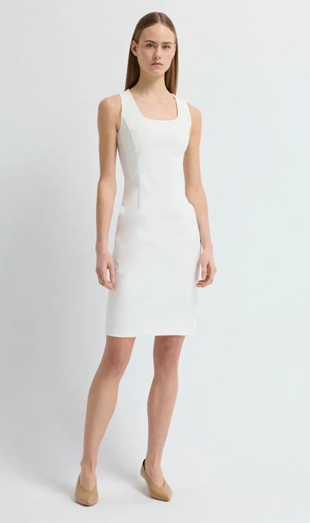 Bu kemik renkli kolsuz kare yakalı elbise, V yaka ve dar kesimiyle rahat ve şık bir görünüm sunar. Düz ve sentetik kumaştan, ofis için uygundur.