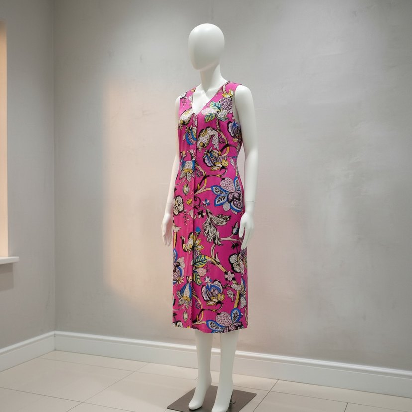 Düğmeli, V yakalı ve renkli bağlama desenli, uzun kollu olmayan elbise. Sentetik kumaştan üretilmiş, bohem tarz için uygun.