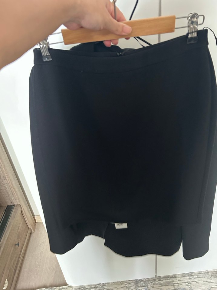 Siyah midi uzunluğunda, dar kesim kadın etek. minimalist ve şık ofis stili için uygundur. Rahat ve zarif bir görünüm sunar. Etiket üzerinde sıfır üründür. Ceket dar kesim olması sebebi ile L etek ise M bedendir.