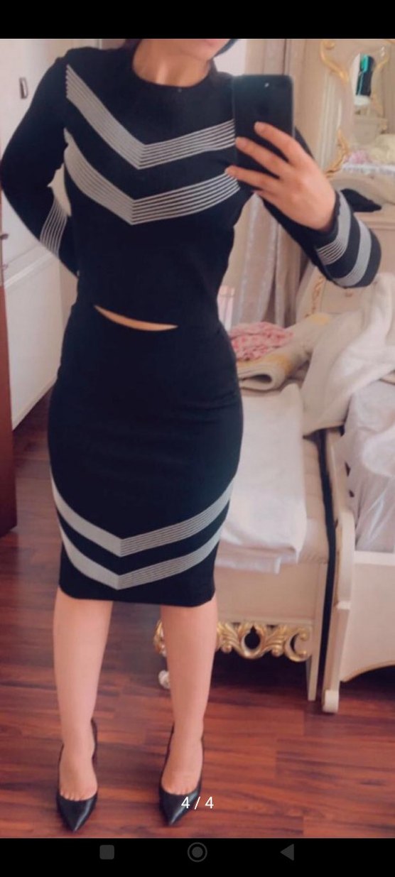 V yakalı, çizgili detaylı, sentetik kumaştan yapılmış siyah kalem elbise. Yırtmaçlı ve askılı kollu, günlük kullanım için uygundur. ürün bir kez kullanılmıştır dar kaliptir