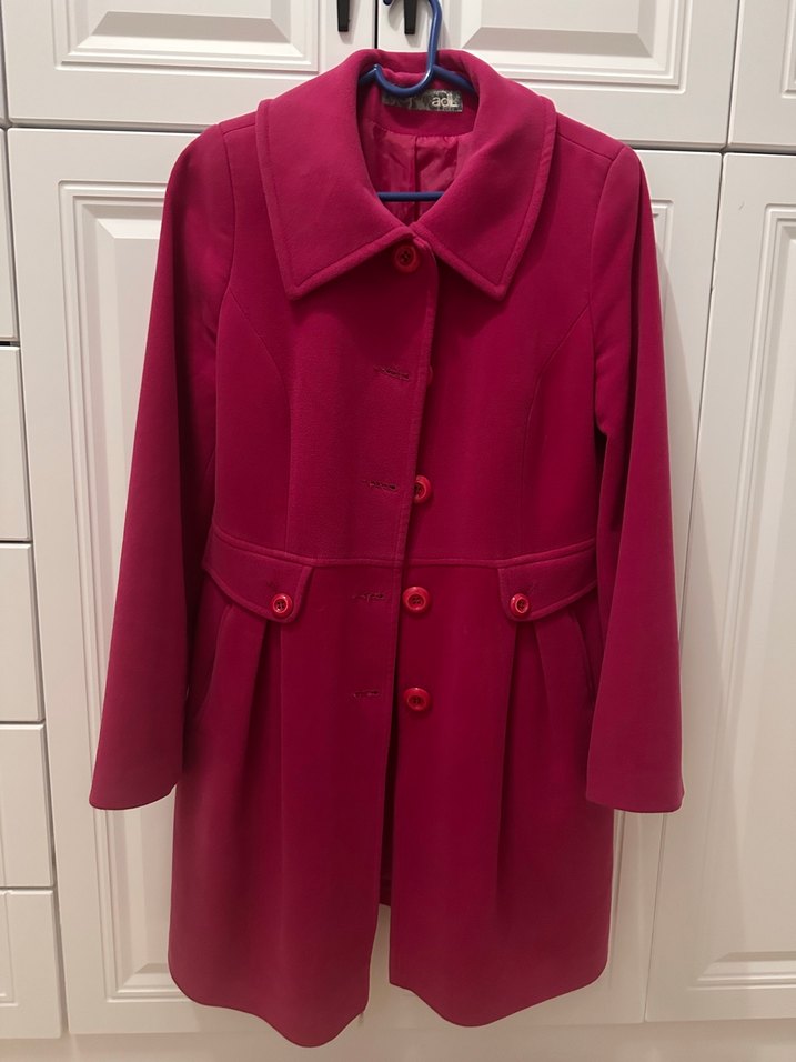 Uzun kollu, geniş yakalı ve düğmeli pembe kadın kabanı. Bel kısmı oturmalı, düğmeli ceplerle detaylandırılmış. Yumuşak ve sıcak kumaşa sahip. Tülerme deforme hiçbir kusuru yoktur