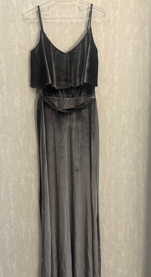 Gri kadife kumaştan, kuşaklı ve askılı uzun elbise. V yaka ve bol kesim ile romantik akşamlar için uygun. Bir akşam giyildi.