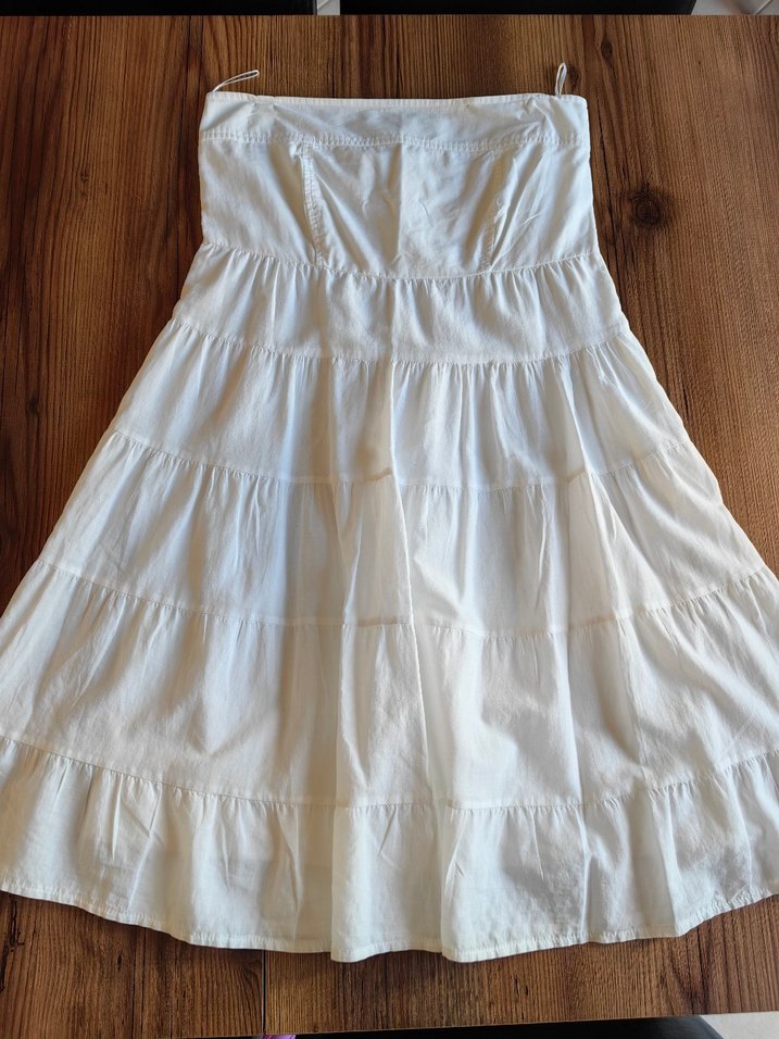 Yumuşak keten kumaştan, fırfırlı detaylı beyaz bohem stilde fiyonklu %100 cotton diz üstü elbise Rahat ve bol kesim, düğün için uygun.
