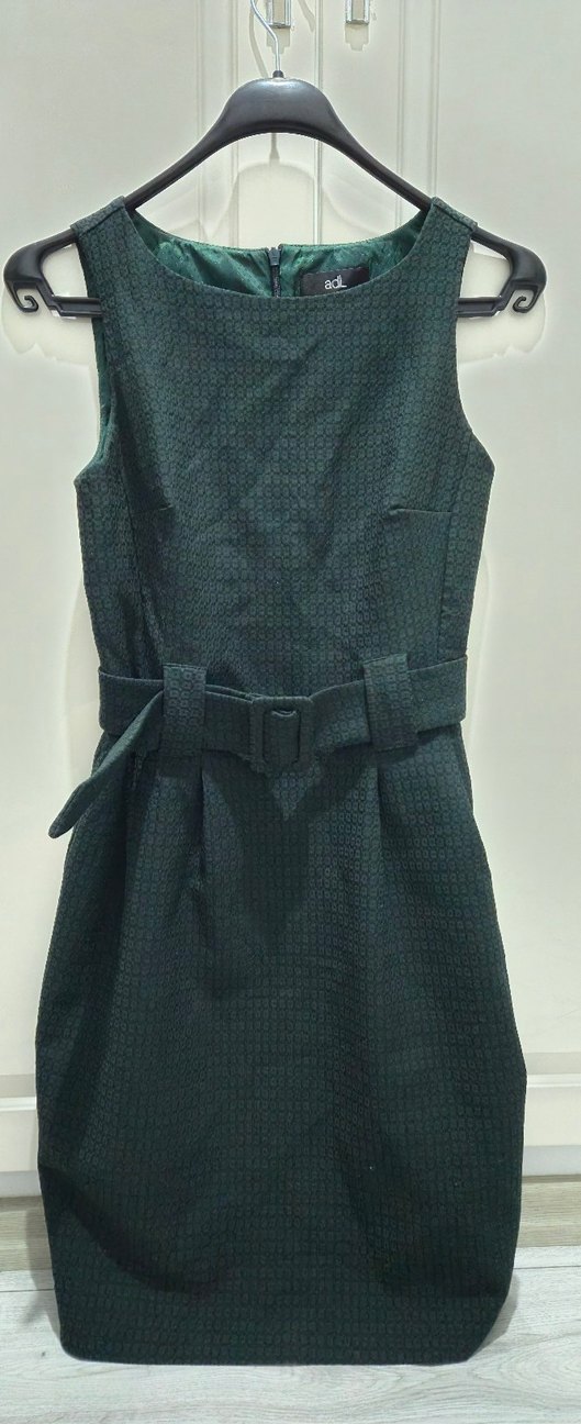 (Adil Işık)Zümrüt Yeşili / Koyu Yeşil S (36) Çok az kullanılmış, tertemiz ve kusursuzdur.%54 Polyester, %45 Pamuk, %1 Elastan karışımlı, tok ve kaliteli bir kumaşa sahiptir. Kendinden kabartmalı jakar dokusuyla oldukça zengin bir görünüm sunar. Vücuda oturan şık kesim, kolsuz model ve zarif bir kayık yaka detayı mevcuttur.Elbisenin kendi kumaşından kaplı, geniş tokalı kemeri ile birlikte gönderilecektir. Bel vurgusu yaparak çok zarif bir silüet oluşturur.İç kısmı tamamen astarlıdır, giyimi konforludur ve iç göstermez.Ofis şıklığı, iş toplantıları, akşam yemekleri veya özel davetler için ideal, zamansız bir parçadır.