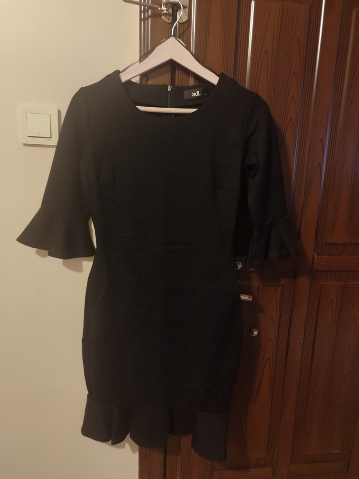 Kol ve etek uçları volan detaylı, siyah ve vücuda oturan midi elbise. Klasik ve şık tasarımıyla ofis kullanımı için uygundur. Sadece bir kez giyilmiş olup hiçbir sorunu yoktur.