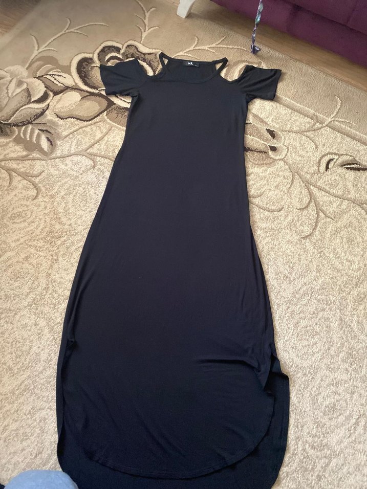 Siyah uzun elbise, fitted kesim sahiptir. Kısa kollu ve kayık yaka, yumuşak sentetik kumaştan üretilmiştir, rahat sokak stili için uygundur.