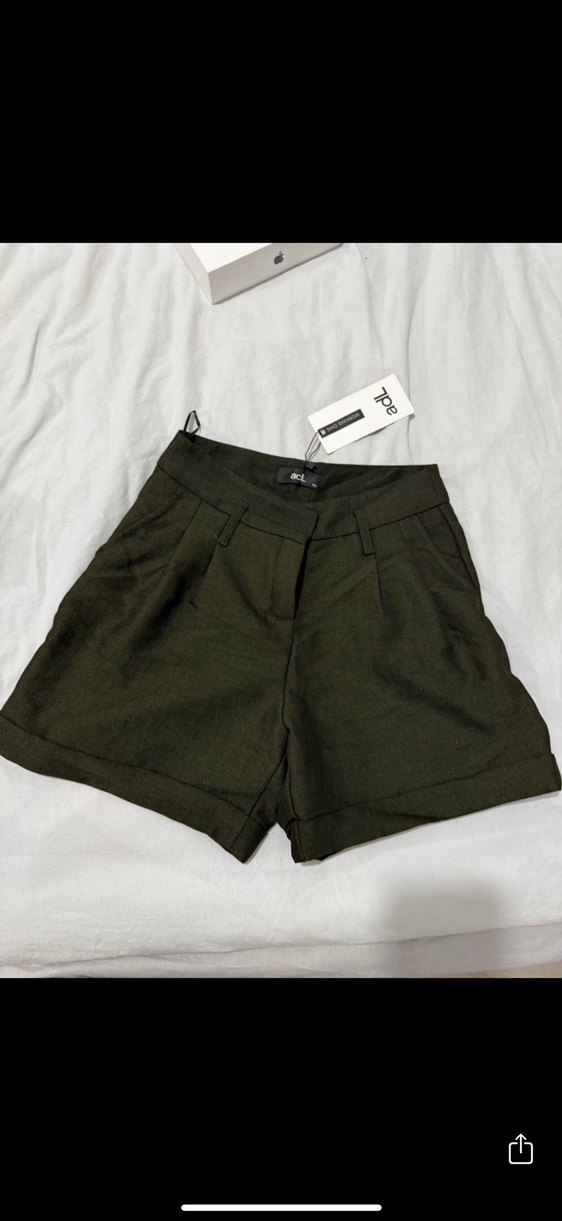 Koyu haki renkte, keten kumaştan, kemerli ve bol kesim mini şort, günlük rahat sokak stili için uygundur.