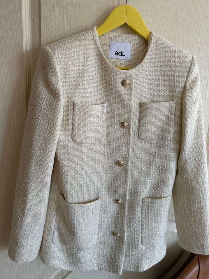 AdL marka, tüvit kumaş düğmeli, uzun kollu, normal boy midi kadın ceket. Ofis kullanımına uygun klasik tarzda, dört cepli. Sayılı kullanılmıştır hiçbir kusuru yok, tertemizdir. Göğüs 45cm, boyu 65 cm iç astarı pamuklu terletmez. EKRU RENGİNDE.