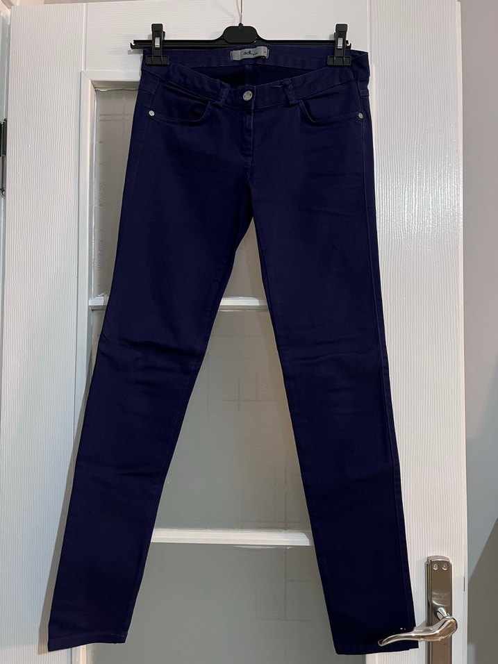 ADL MARKA Lacivert kot pantolon, normal kesim ve midi boyda. Desensiz, rahat ve şık, ofis için uygun günlük stil sağlar. Çok iyi durumda bir iki kere giyilmiştir.