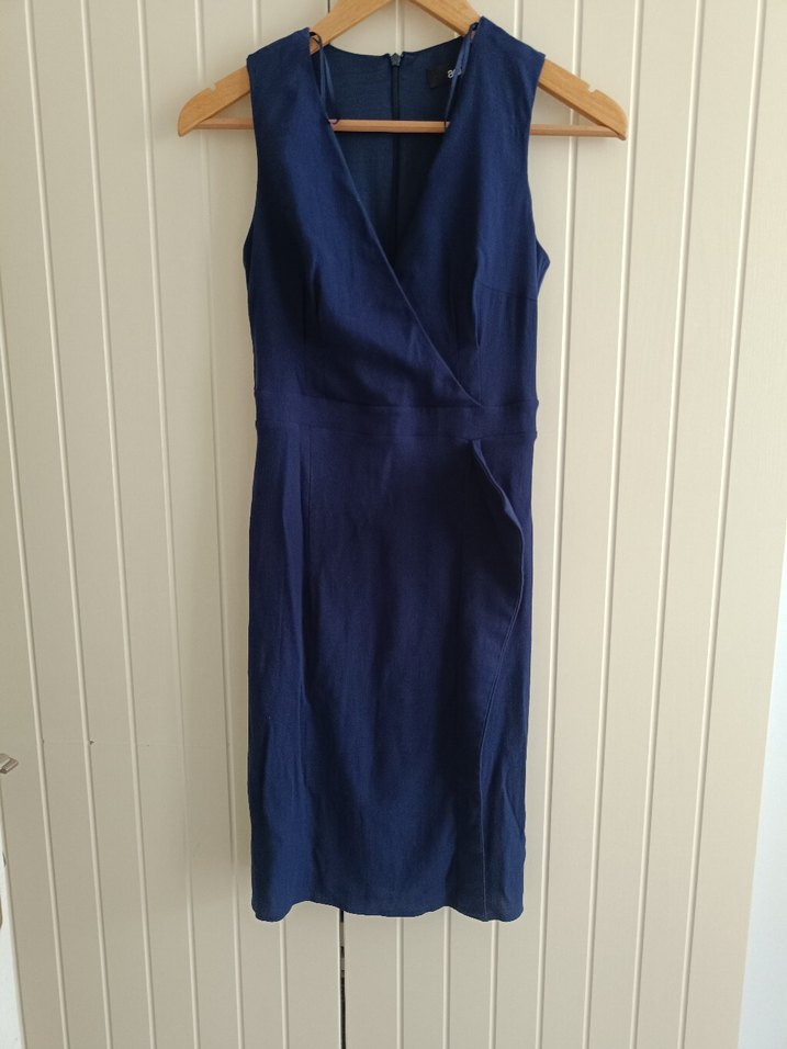 Lacivert kruvaze elbise, V yakalı ve drapeli, vücuda oturan kesime sahip. Modern klasik tarzda, ofis için uygun. Astarlıdır. İki kol arası 34 cm, boy 91, bel 30 cm, kol genişliği 17 cm.