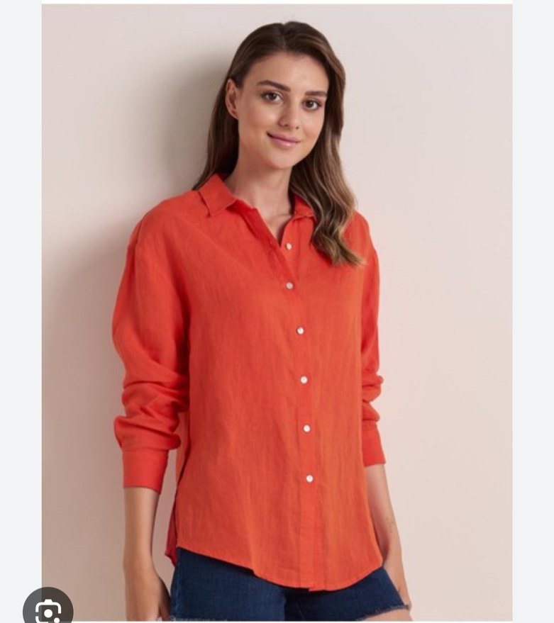 Kadın keten kumaştan, düğmeli, uzun kollu, bol kesim, tek renk açık kırmızı gömlek. Günlük kullanıma uygun, modern tarzda ve tekne yakalı.jimmy key s beden %100 keten gömlek ürün bir kez kullanıldi lila rengi de mevcuttur