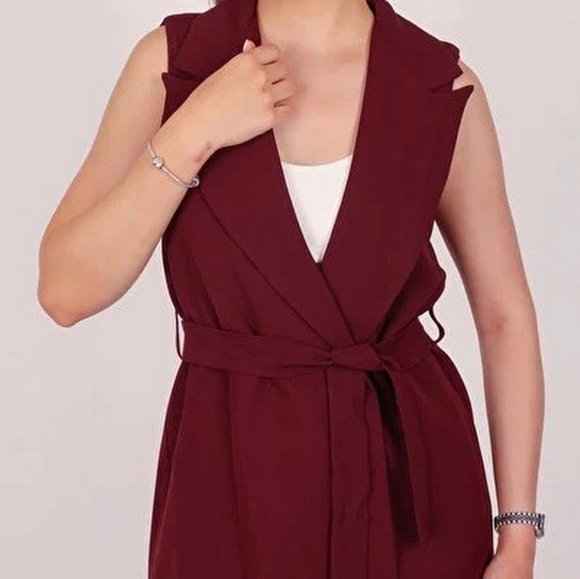 Bordo renkli, parlak ve ipeksi kumaştan, kemerli, V yaka, kolsuz, midi uzunlukta, vücuda oturan kadın yeleği. Trendy ve günlük kullanıma uygun.
