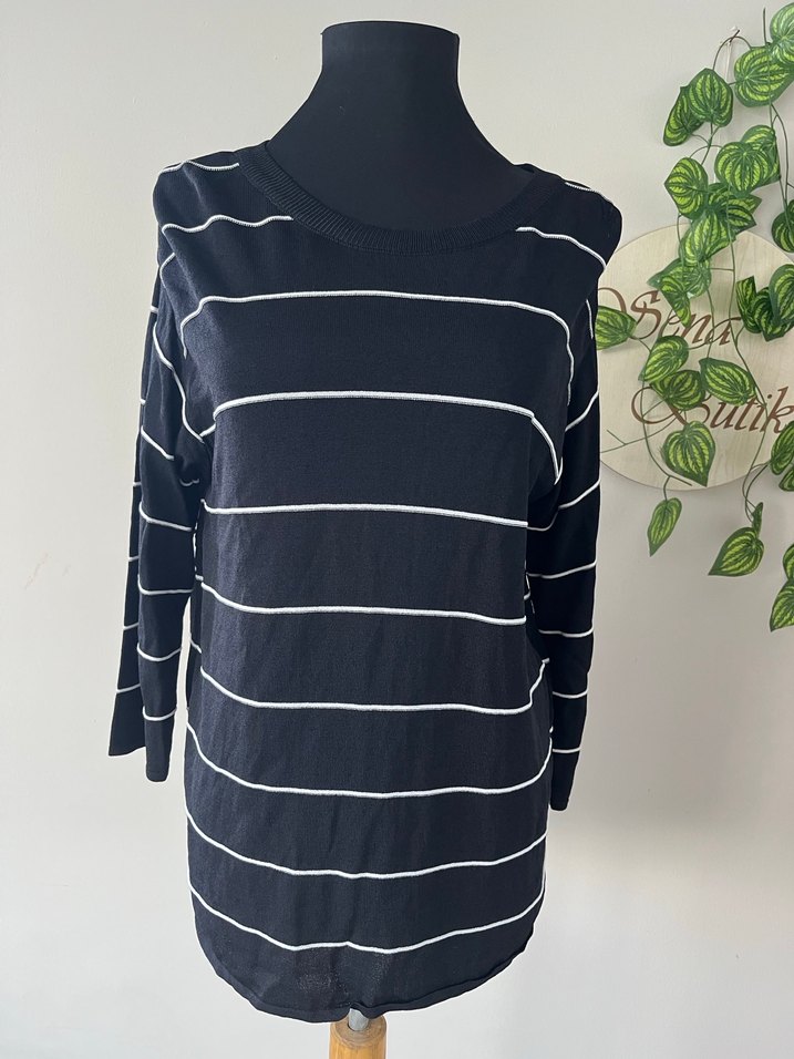 Siyah renkli, çizgili ve pamuklu örme kumaştan yapılmış, yuvarlak yaka ve uzun kollu hamile triko sweatshirt. Salaş kesimiyle rahat kullanım sağlar.
