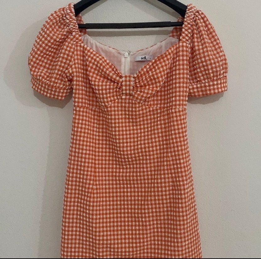 adL markalı, turuncu kareli ve fırfırlı elbiseTekne yaka, askılı kollu, bol kesim ve sentetik kumaştan üretilmiştir. Bohem tarzda günlük kullanıma uygun.