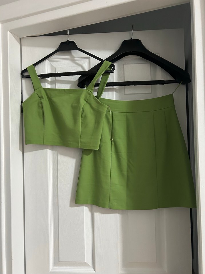 Yeşil, askılı kolları olan, vücuda oturan mini elbise. Yumuşak sentetik kumaştan üretilmiş, desen içermeyen rahat bir modeldir. İkili takım olarak satılıyor. Sadece 1 kere giyildi. 36 beden, Adil ışık(ADL) markasına aittir, defosu yok