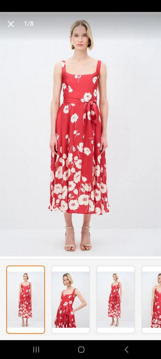 Kırmızı zemin üzerine ekru çiçek desenli, askılı midi boy elbise Bel kısmındaki kuşak detayı sayesinde vücuda zarif bir form verir. Akışkan ve dökümlü yapısıyla hem rahat hem feminen bir duruş sağlar. Davet, nişan, mezuniyet ve yaz akşamları için ideal ✨