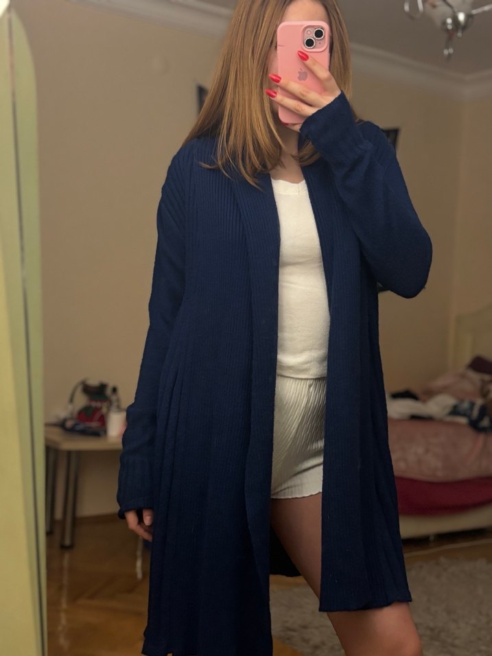 Lacivert triko, uzun kollu, notched lapel yakalı, bol kesim midi boy hırka. Günlük kullanıma uygun, sade ve rahat tarzda bir parça.