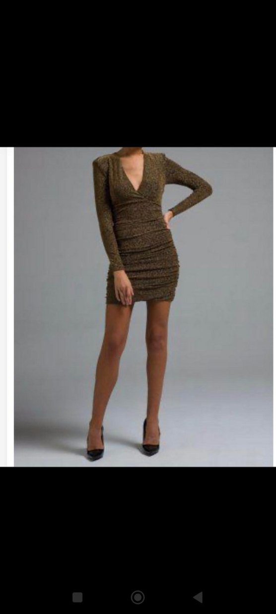 Kahverengi simli mini elbise, uzun kollu ve V yakalı, vücuda oturan kesimi ve drapeli tasarımıyla romantik akşamlar için uygundur.