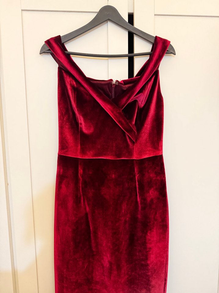 Bordo renkte, drapeli V yaka ve kolsuz tasarıma sahip, klasik modern stilde, midi boy abiye elbise. Romantik akşamlar için uygun, vintage havasında şık bir parça.