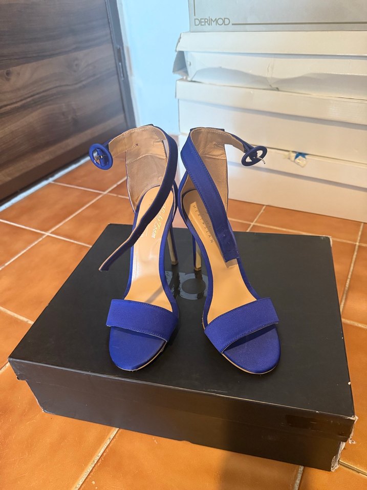 ADL markalı koyu saks saten stiletto topuklu, tokalı bantlı, çağdaş ve minimal tasarımlı kadın ayakkabı, romantik gece için uygun.
