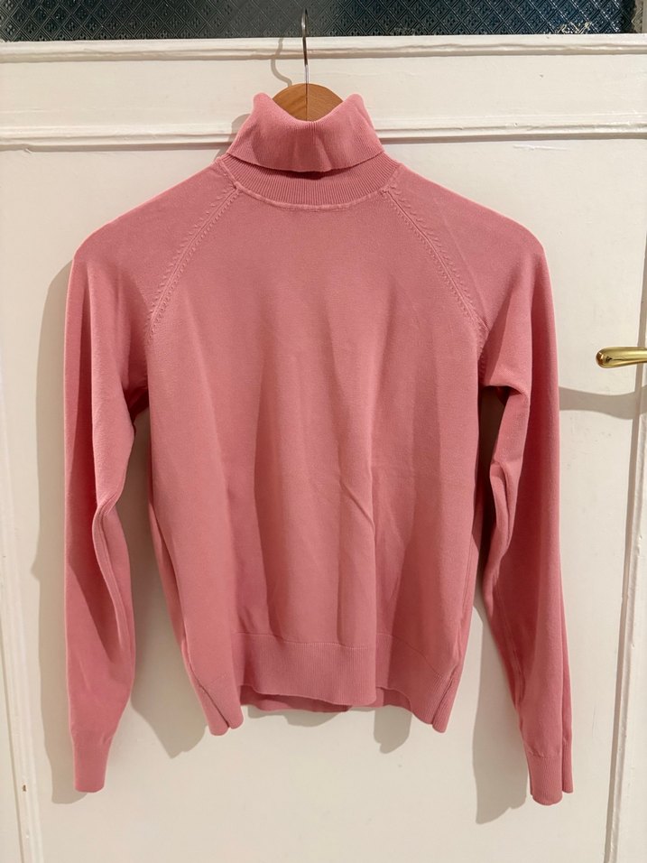 Pembe balıkçı yaka, uzun kollu, ince triko kumaştan yapılmış, normal boyda ve sade tasarımlı kadın kazak. Günlük kullanıma uygundur.