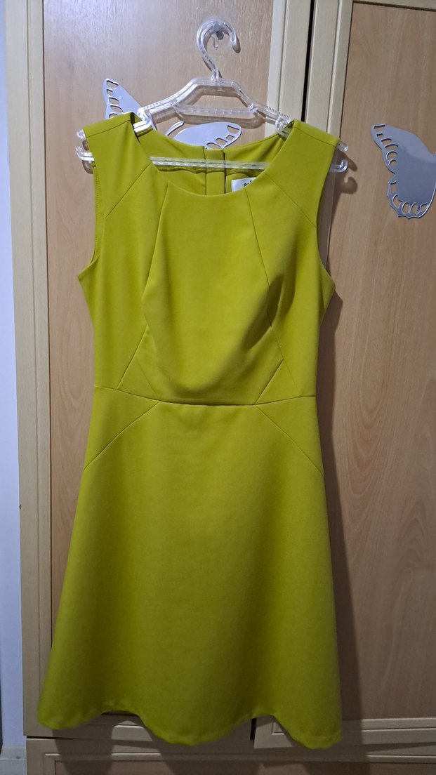 Parlak sarı renkte, kolsuz ve drapeli detaylara sahip midi boy, vücuda oturan kadın elbisesi. Çağdaş ofis şıklığı için uygun. 3 kere fln giydim. cok iyi durumda