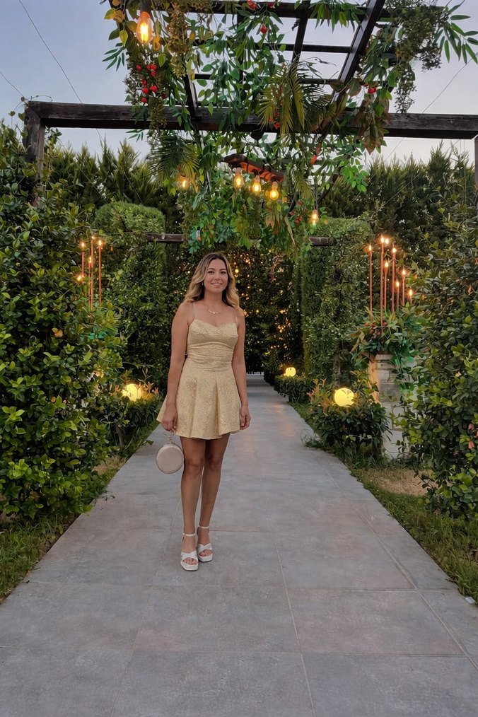 Açık sarı renkli, mini uzunlukta, straplez ve askılı kollu, bohem tarzda, klasik şıklıkta düğün elbisesi. Romantik akşamlar için uygun.Sadece bir kez kullanıldı