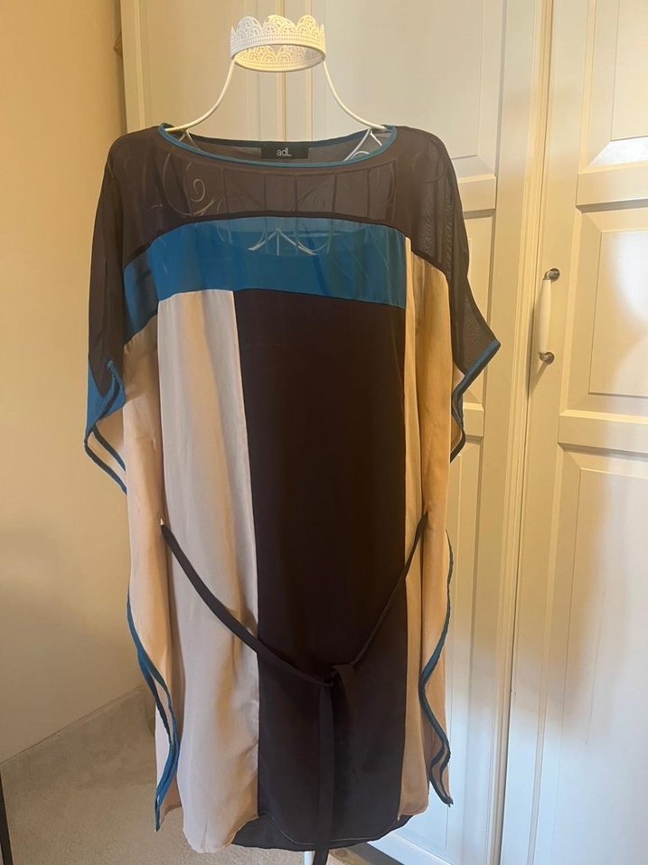 ürün bir kere giyildi m/l beden uyumlu hiçbir defosu yok ister elbise ister tunik olarak kullanılır dizüstü hizasında şifon olduğu için içinde ayrıca askılı kendi elbisesi var kuşaklı yada kuşaksız kullanılabilir