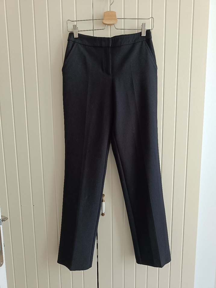 Siyah kumaştan yapılmış, normal kesim ve midi boyda, yırtmaç detaylı kadın pantolonudur. Ofis ve günlük kullanıma uygundur. ADL ve Cengiz Abazoğlu markalı. Bel 34 cm, boy 100 cm, ağ yerinden basen 24 cm, paça 16 cm. Kalın ama yumuşak bir kumaşı var
