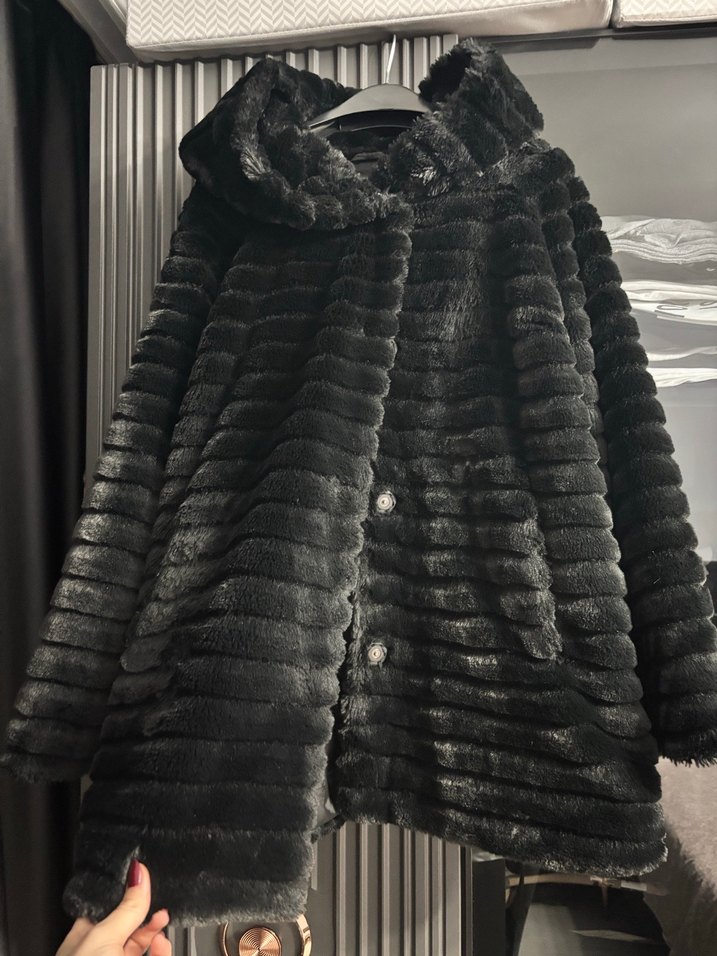 Yumuşak fleece kumaştan yapılmış siyah kürk detaylı, çizgili desenli ve normal uzunlukta, bol kesim bir mont. Günlük kullanıma uygun, gotik tarzda rahat bir parça.